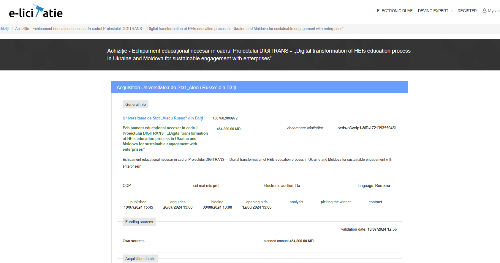 Procedura de achiziție a echipamentelor în cadrul proiectului DIGITRANS, desfășurată de BE 009 – Universitatea de Stat „Alecu Russo” din Bălți (USARB) s-a realizat transparent, pe platforma oficială MTender (e-licitație pentru proceduri publice, private și deschise), prin publicarea anunțului ce conținea termenii, condițiile și criteriile de selecție.